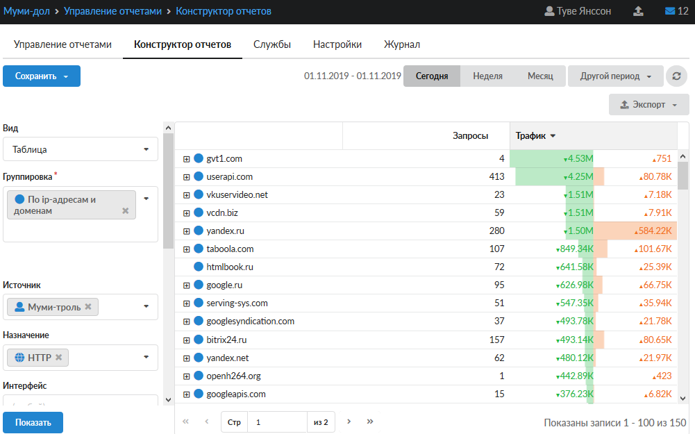 Чтобы вывести список запросов пользователей на ip-адреса и домены, посещенных пользователем или группой пользователей, перейдите во вкладку «Конструктор отчетов» модуля «Управление отчетами».
