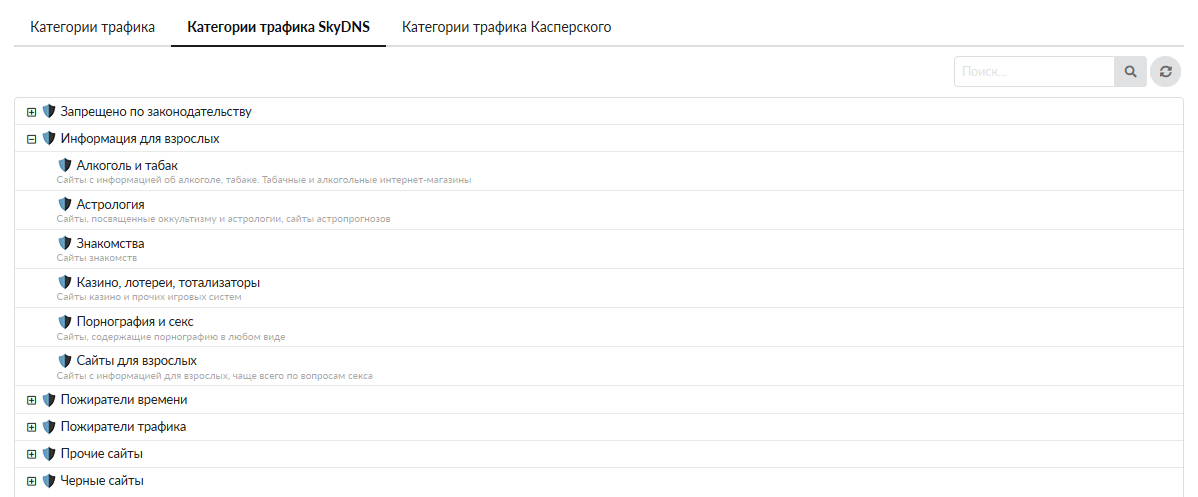 В окне модуля отображены все заведенные группы категорий трафика. Встроенные группы редактировать и удалить нельзя, возможно только экспортировать содержимое категории. Группы обозначенные логотипом компании «Лаборатория Касперского» будут заполнены в случае приобретения соответствующего модуля. Группы обозначенные логотипом компании «СкайДНС» (щит сине-черный) будут заполнены в случае приобретения соответствующего модуля. Остальные группы являются или встроенными или заведенными Пользователем «ИКС» и обозначены в виде томов.