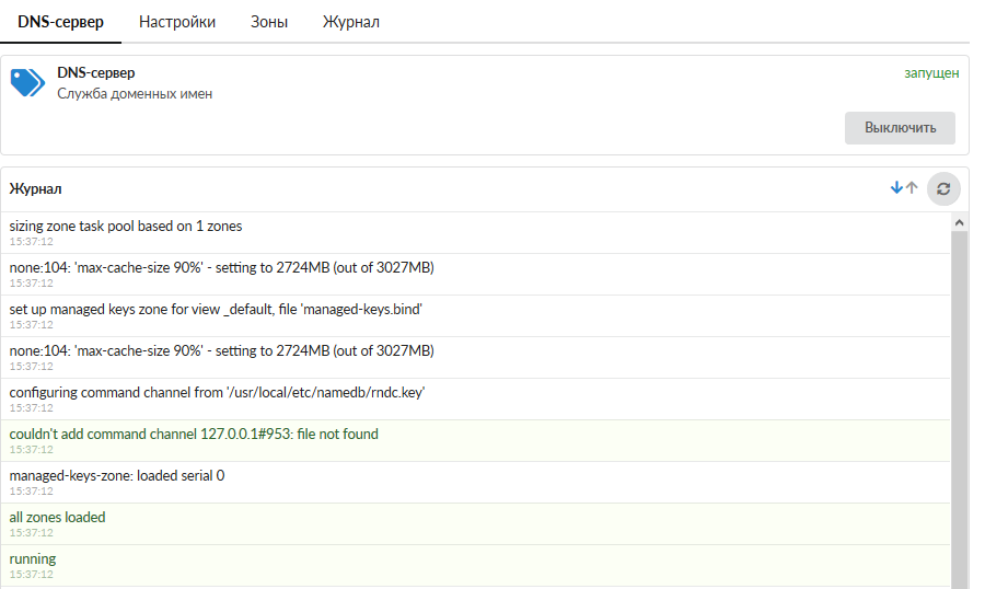 Функции DNS-сервера в ИКС исполняет свободное программное обеспечение bind. При входе в модуль отображается его состояние, кнопка «Выключить» (или «Включить» если модуль выключен) и последние сообщения в журнале.