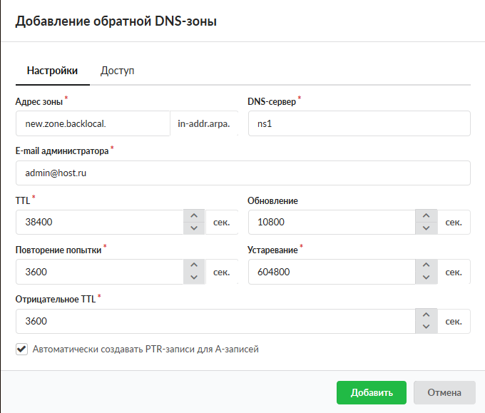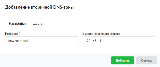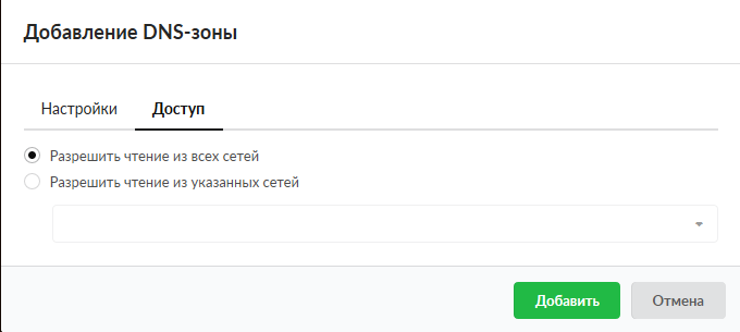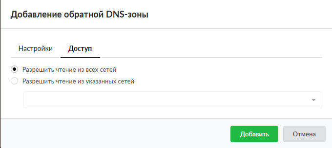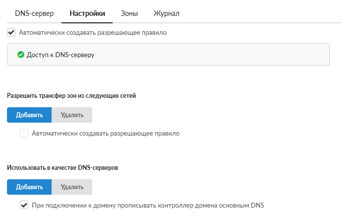 Основной внешний параметр DNS-сервера - список разрешений для трансфера зон. Сюда добавляются адреса других DNS-серверов, которые имеют право получать записи зон от ИКС.