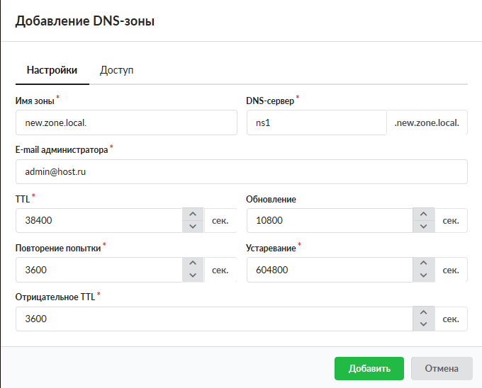 Вкладка «Зоны» позволяет создавать DNS-зоны для работы различных служб ИКС, таких как веб-сервер, почтовый сервер и джаббер-сервер.