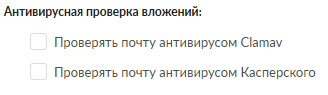 Данный блок включает проверку входящих и исходящих писем на наличие в них вирусов. При положительном результате вместо самого письма получателю придет сообщение о результатах проверки, а само письмо будет во вложении к сообщению. Проверка антивирусом (Clamav, DrWeb, Касперского, для использования антивируса необходимо произвести соответствующую настройку) активируется за счет установки соответствующего флага напротив имени антивируса.