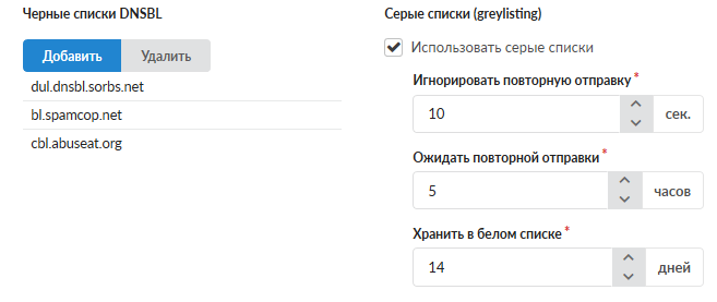 Данный блок предназначен для установки автоматической блокировки спама. При установке флажка «Использовать серые списки» «ИКС» будет отслеживать поведение почтовых серверов, которые отправляют письма на «ИКС». О методологии блокировки можно прочитать https://ru.wikipedia.org/wiki/%D0%A1%D0%B5%D1%80%D1%8B%D0%B9_%D1%81%D0%BF%D0%B8%D1%81%D0%BE%D0%BA.
