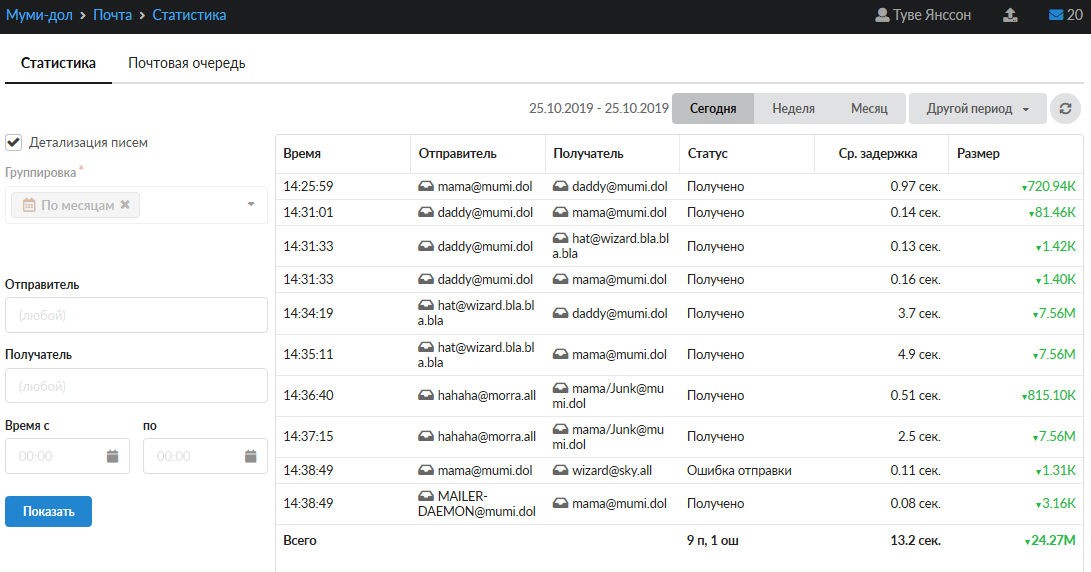 Для отображения статистических данных по почтовому серверу «ИКС», соответствующих введенным параметрам необходимо нажать кнопку «Показать». Вывод будет представлен во втором блоке в виде таблицы. Столбцы таблицы варьируются в зависимости от применяемого фильтра.