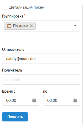 Поле «Группировка» предназначено для формирования отчета по времени (по месяцам, дням или часам), доменам (по доменам отправителя, по доменам получателя) или ящикам (по ящикам отправителя, по ящикам получателя). Возможен выбор только одного значения для группировки записей.