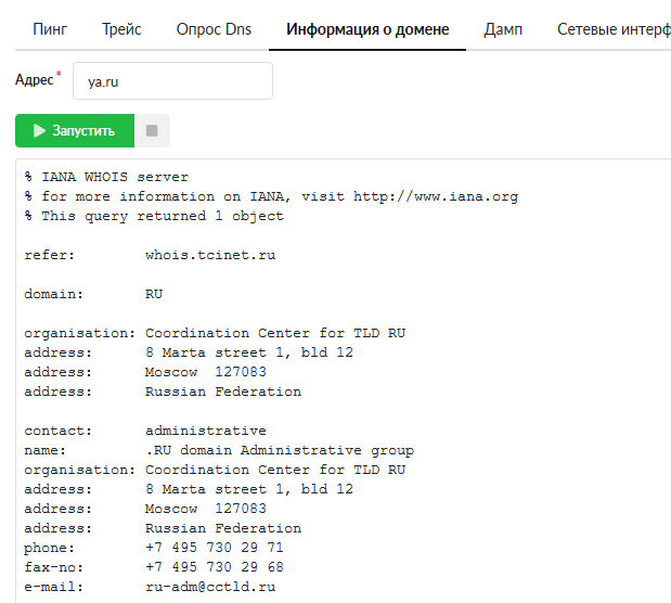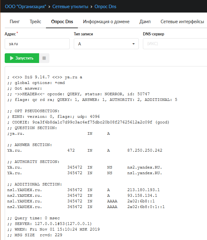При использовании необходимо ввести домен и выбрать тип записи, также можно указать конкретный dns сервер для опроса. Более подробно о типах записи смотрите в руководстве по использованию модуля DNS.