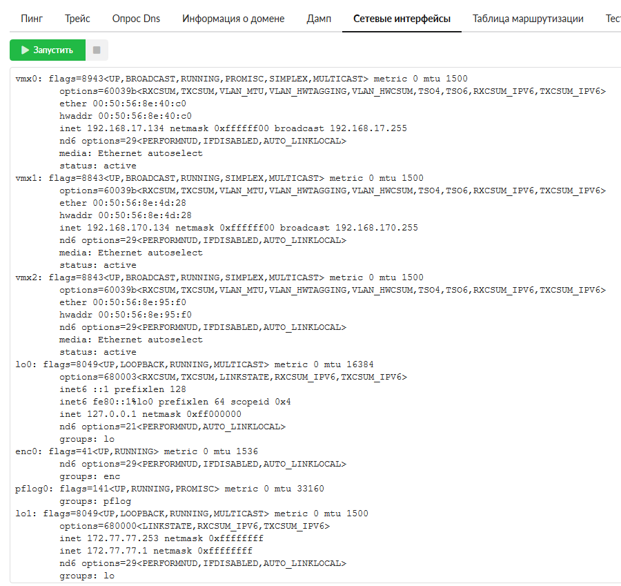 Утилита «Сетевые интерфейсы» позволяет получить сведения о состоянии всех интерфейсов ИКС. Она выводит результат команды ifconfig, позволяя узнать, какие ip-адреса назначены каждому интерфейсу, какие виртуальные интерфейсы созданы, а также проверить наличие сигнала в подключенном кабеле.