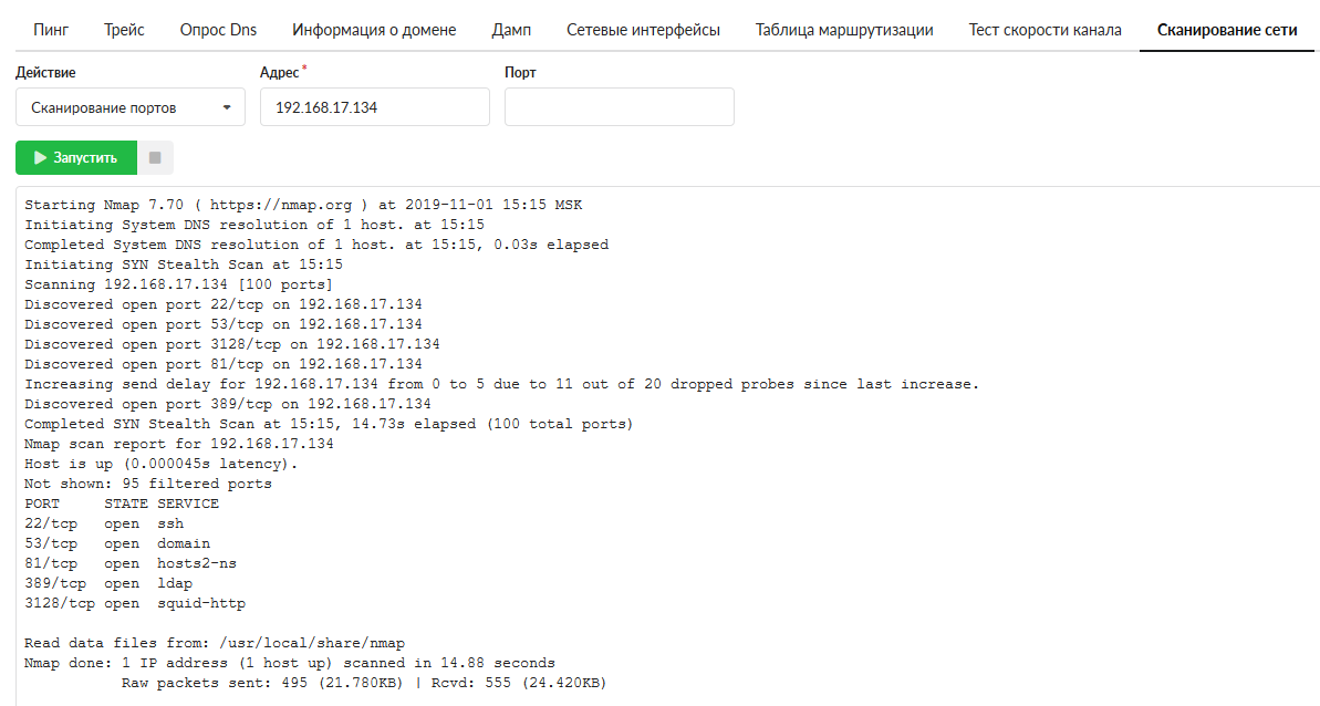С помощью сканирования сети вы можете тестировать безопасность локальной сети предприятия. Она позволяет проверить доступность локальных машин, а также определить открытые в сети порты. Кроме того, указав в качестве исследуемого хоста сам ИКС, вы можете дополнительно проверить безопасность системы на предмет доступных портов.