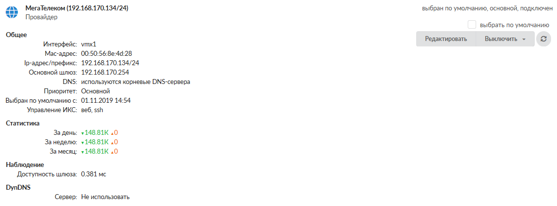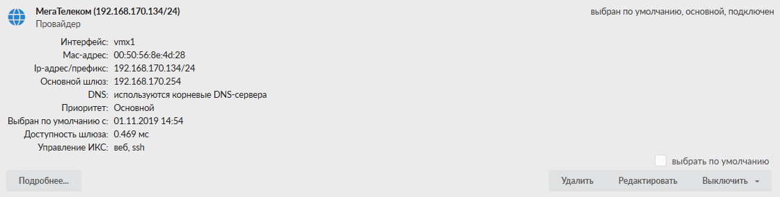 В «закрытом» состоянии отображается только имя сети, ip-адрес интерфейса, статус сигнала и доступность шлюза (для провайдеров). При выделении объекта кликом мыши показываются все его основные параметры. Любой объект можно отредактировать или удалить при помощи кнопок верхней панели или дублирующих их кнопок напротив имени объекта. Кроме того, при необходимости его можно выключить, а затем снова включить - это удалит настройки интерфейса без необходимости заново создавать объект. Также, на верхней панели находится кнопка запуска мастера настройки сети.