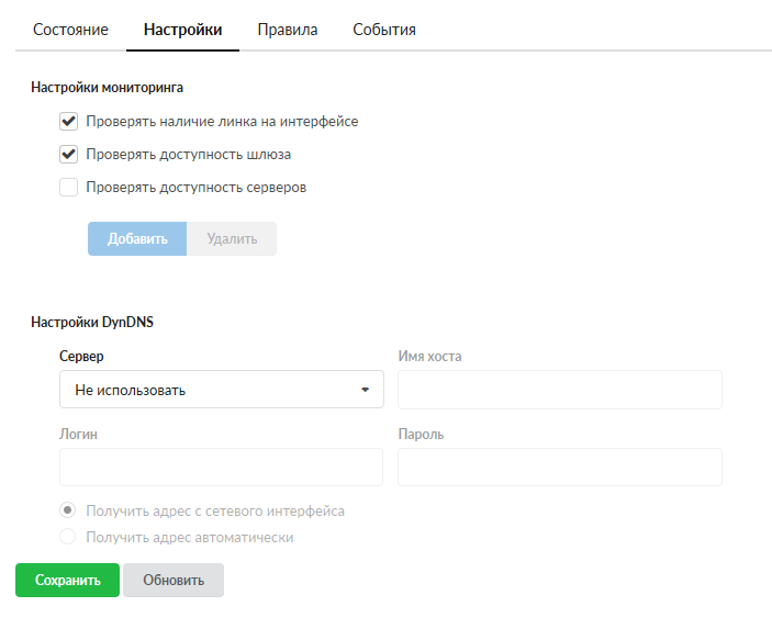 Во вкладке «Настройки» можно задать критерии мониторинга и определить параметры DynDNS.