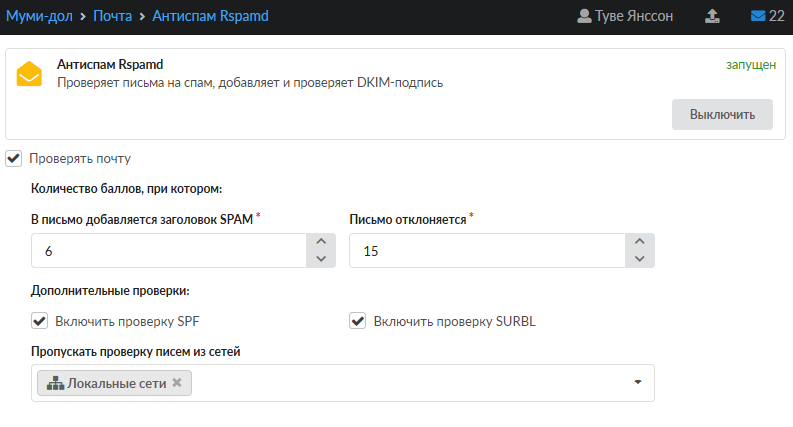 Модуль «Антиспам Rspamd» расположен в Меню «Почта». Он предназначен для определения, является ли письмо спамом, в этом случае тема письма будет изменена, а также для отклонения подобных писем. При открытии модуля в основном окне отобразится состояние службы «Антиспам Rspamd» с возможностью «Выключить» (или «Включить» если служба выключена) и настройки службы.