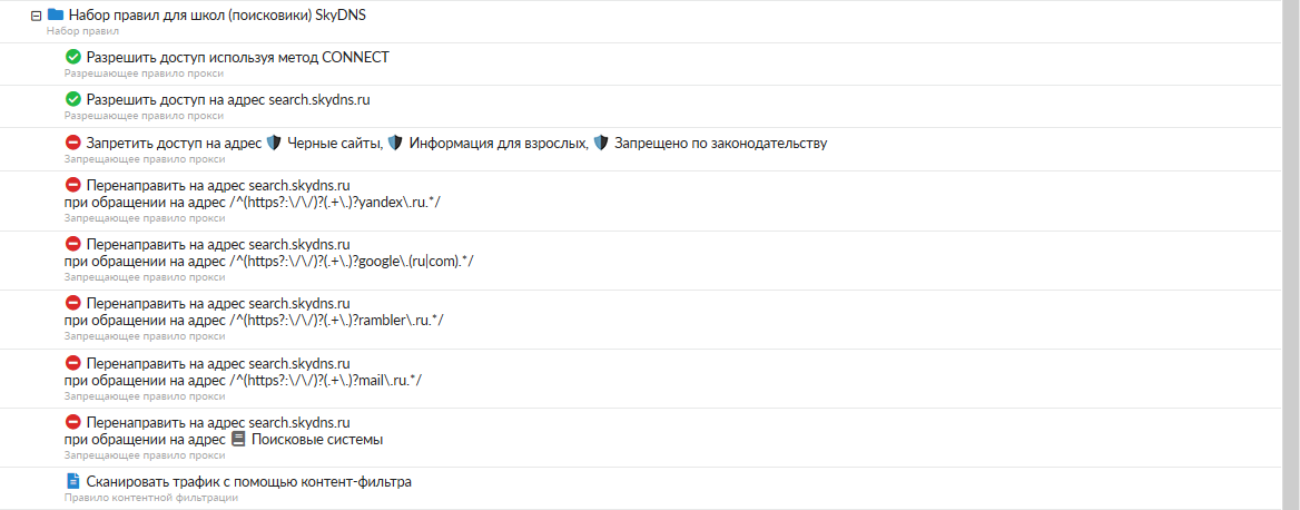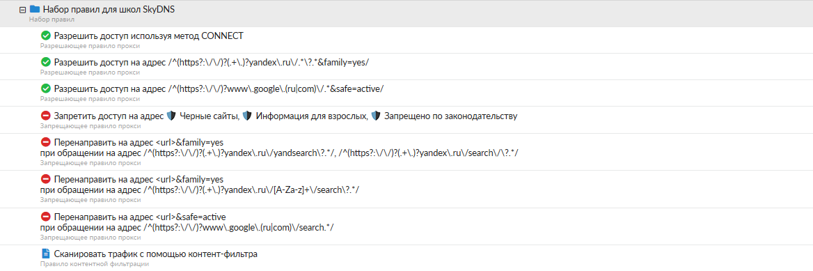Набор правил для школ SkyDNS. Данный набор правил предоставляет доступ к поисковым системам в безопасном режиме; блокирует доступ к интернет ресурсам из набора категорий (общие, черные сайты, сайты для взрослых, мошенничество, вирусы), в том числе от сервиса SkyDNS; сканирует трафик с помощью контент-фильтра (если контент-фильтр включен).