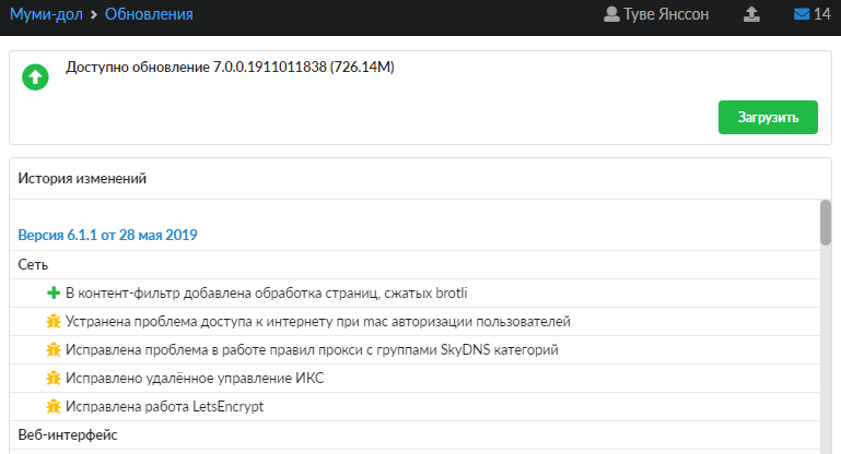 Если для «ИКС» доступно обновление, то напротив Меню «Обслуживание» загорится красный кружок, а напротив модуля «Обновления» отобразиться номер доступной версии. В самом же модуле «Обновления» появится кнопка «Загрузить». При нажатии на кнопку «Загрузить» начнется загрузка обновления. Стоит отметить, что при не достаточном месте на жестком диске (менее четырех кратного объема обновления), кнопка «Загрузить» будет не доступна, а в статусе красным цветом будет написано «недостаточно места на диске». Процесс загрузки можно прекратить нажав, появившуюся кнопку «Остановить загрузку». После загрузки обновления появится кнопка «Установить», которую необходимо нажать для начала установки.