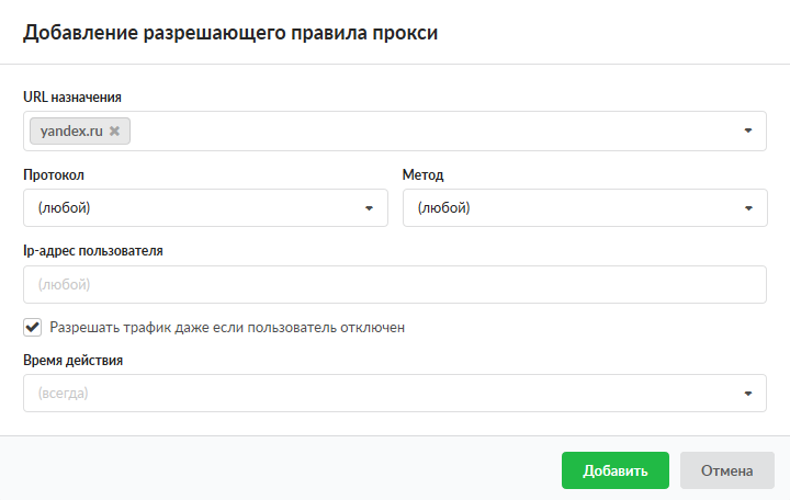 Установка флага «Разрешить трафик даже если пользователь отключен» означает, что если Пользователь был отключен или превысил квоту в «ИКС», то он будет иметь доступ к ресурсам указанным в данном правиле.