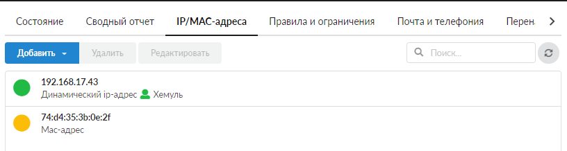 Данная вкладка отображает пред настроенный сводный отчет по Пользователю. Который включает в себя: общие данные Пользователя (Статус, Логин, Логин для адресной книги, ip-адреса, Скорость, Статистику за день, неделю, месяц); статистику по часам входящего/исходящего трафика за текущие сутки; топ 5 ip-адресов или доменов; а также топ 5 категорий, к которым относится наработанный трафик. Вкладка «IP/MAC-адреса». На данной вкладке располагаются кнопки: «Добавить», «Удалить» и «Редактировать». При нажатии на «Добавить» возможно задавать ip-адреса конкретному Пользователю, при этом если Пользователь активен в сети, то «ИКС» определить его mac-адрес. При выделении поля с ip-адресом можно связать заданный ip-адрес с mac-адресом устройства или удалить данную информацию. При задании mac-адреса, если Пользователь активен, «ИКС» автоматически выделить ему ip-адрес. При редактировании или добавлении возможно задать комментарий к ip-адресу или mac-адресу.