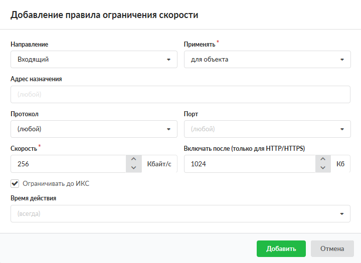 При установке флага «Ограничивать до ИКС», правилом также будут учитываться соединения входящие на «ИКС» (например, при доступе к ftp-ресурс или графическому интерфейсу).