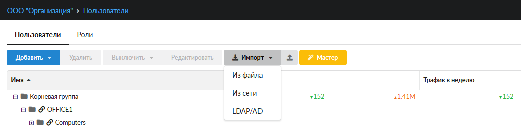 В основном окне модуля «Пользователи» выбрать «Импорт». Откроется выпадающий список, предлагающий выбрать, каким образом пользователи будут импортированы. Существует три варианта: из файла, из сети, из LDAP/AD.