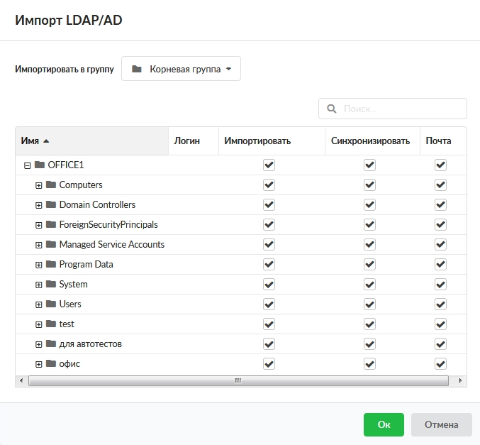 После ввода данных будет выведен список Пользователей домена, сгруппированных по Organization Unit, а также выбор требуемых действий относительно Пользователя. Будет предложено три возможных действия: «Импортировать», «Синхронизировать» и «Почта». А также выбор в какую группу производиться импорт. При установке флага в графе «Импортировать» будет импортировано имя и логин соответствующего Пользователя. Для синхронизации Пользователя или группы необходимо установить флаги «Импортировать» и «Синхронизировать». При этом Пользователь или группа будут импортированы таким образом, что любое изменение данного объекта в дереве контроллера домена аналогичным образом отразится на объекте в «ИКС». А также будут импортированы и синхронизированы имена групп безопасности из Active Directory (AD) в Наборы правил. Данные наборы правил будут пустыми, но назначенными на Пользователей как и в AD. Импортируются только те группы безопасности, в которых Пользователей явно указан. Родительские группы безопасности,импортированных групп безопасности, не импортируются. Для импорта почтового ящика из домена необходимо установить все три флага. При этом для выбранного Пользователя будет создан почтовый ящик с аналогичным именем в том случае, если в «ИКС» был почтовый домен аналогичный домену из AD, иначе почтовый ящик импортирован не будет.
