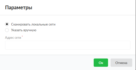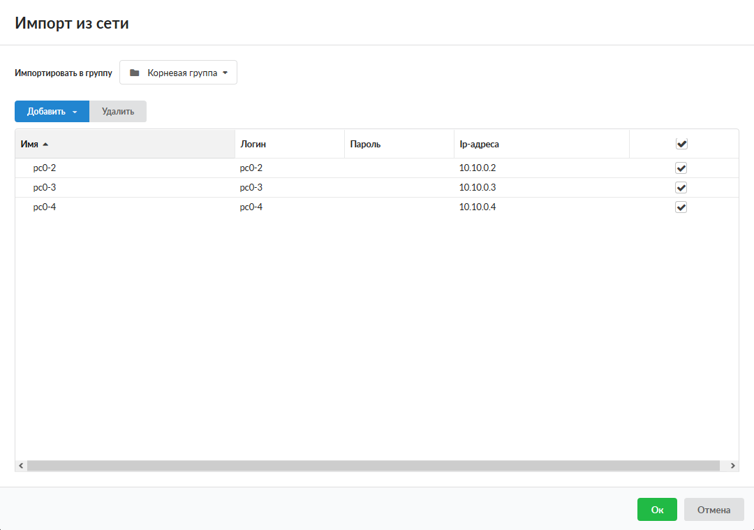 Из сети. Будет предложено указать в ручную ip-адреса сети или сканировать локальные сети подключенные к «ИКС». При сканировании локальной сети «ИКС» отобразит все активные ip-адреса, отвечающие на icmp пакеты, в настоящий момент, присвоив им имена и логины в виде pcX-Y, где X – это предпоследняя цифра ip-адреса, а Y -последняя цифра ip-адреса. В случае подключения ИКС к Active Directory, вместо pcX-Y будут указано имя компьютера введенного в домен. Отметив нужных для импорта Пользователей в списке, необходимо нажать кнопку ОК.