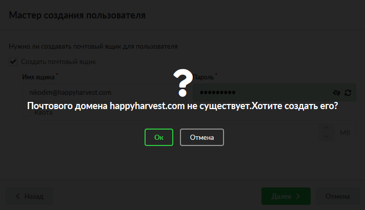Из всех перечисленных параметров обязательным является только имя Пользователя или группы. Стоит отметить, что в случае, если назначаемый почтовый ящик не может быть присвоен ни одному из созданных в системе почтовых доменов, «ИКС» предложит создать новый почтовый домен.