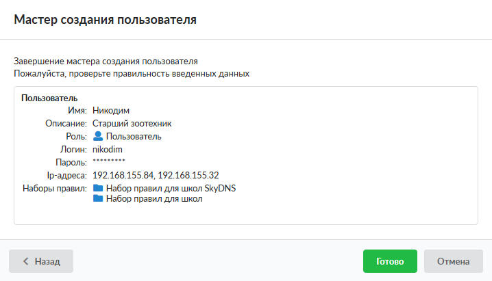 Если был выбран пункт «Создать группу», будет предложено ввести имя группы и ее описание, далее ip-адреса устройств относящихся к данной группе, далее назначить набор/наборы правил ограничений созданных в «ИКС» или не назначать ни одного, и на последнем шаге будет предложено проверить введенные данные. Если все данные были введены правильно можно нажать «Готово», иначе нажать «Отмена» или «Назад» для возвращения на неправильно введённый пункт.